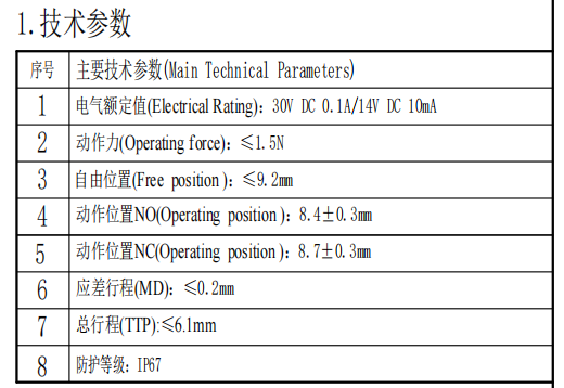 | 1 | Rátáil leictreach | 10ma 14V DC/0.1A 30VDC | |